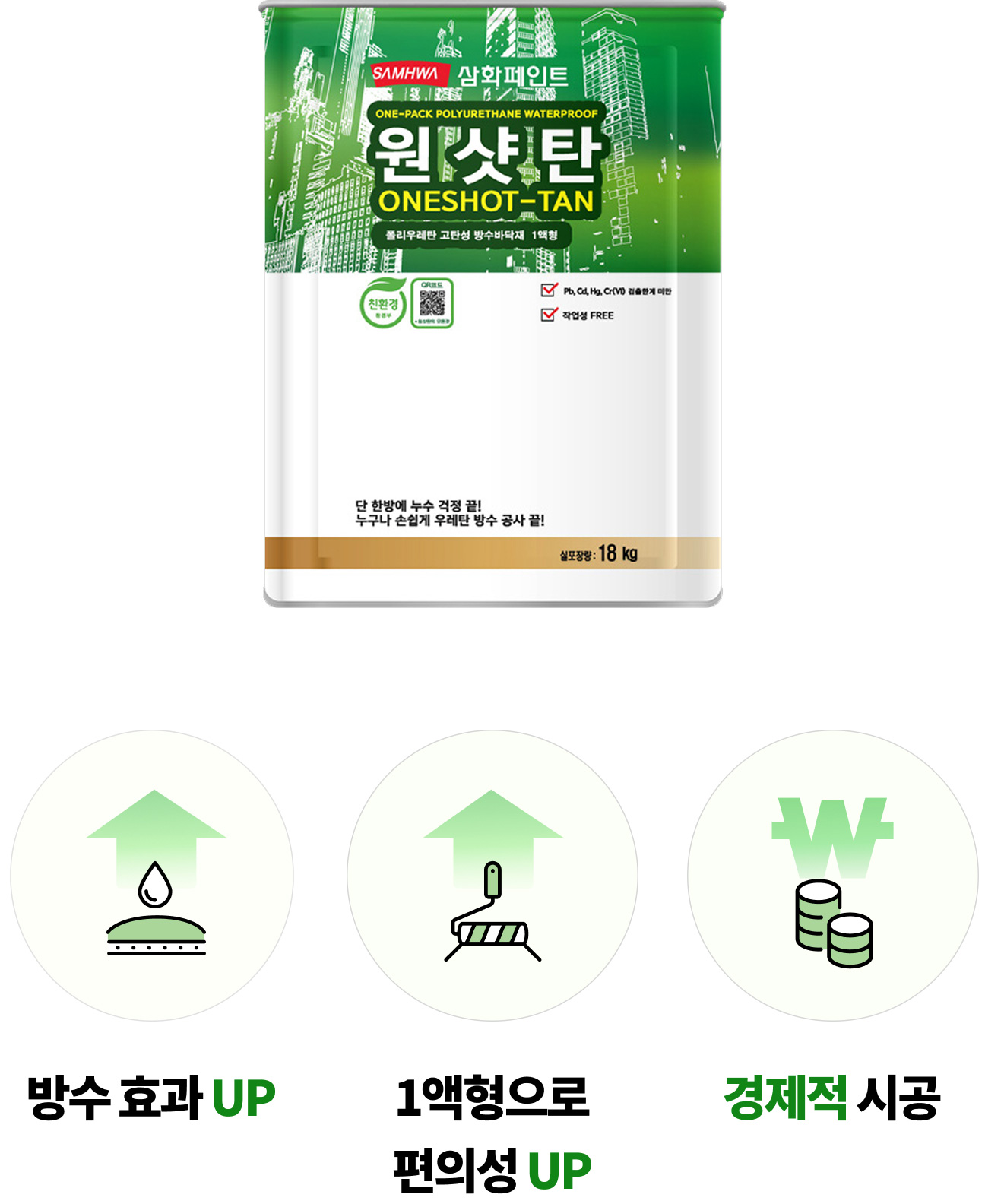 1액형이라 간편한 원샷탄은 도료의 주성분이 공기 중 수분과 반응해 탄성이 우수한 도막을 형성하는 탄성 우레탄 제품입니다. 후도막이 형성돼 우수한 방수 효과를 나타내며 접착력이 좋고 하지의 균열이나 수축 팽창에도 적응력이 뛰어난 방수재입니다.